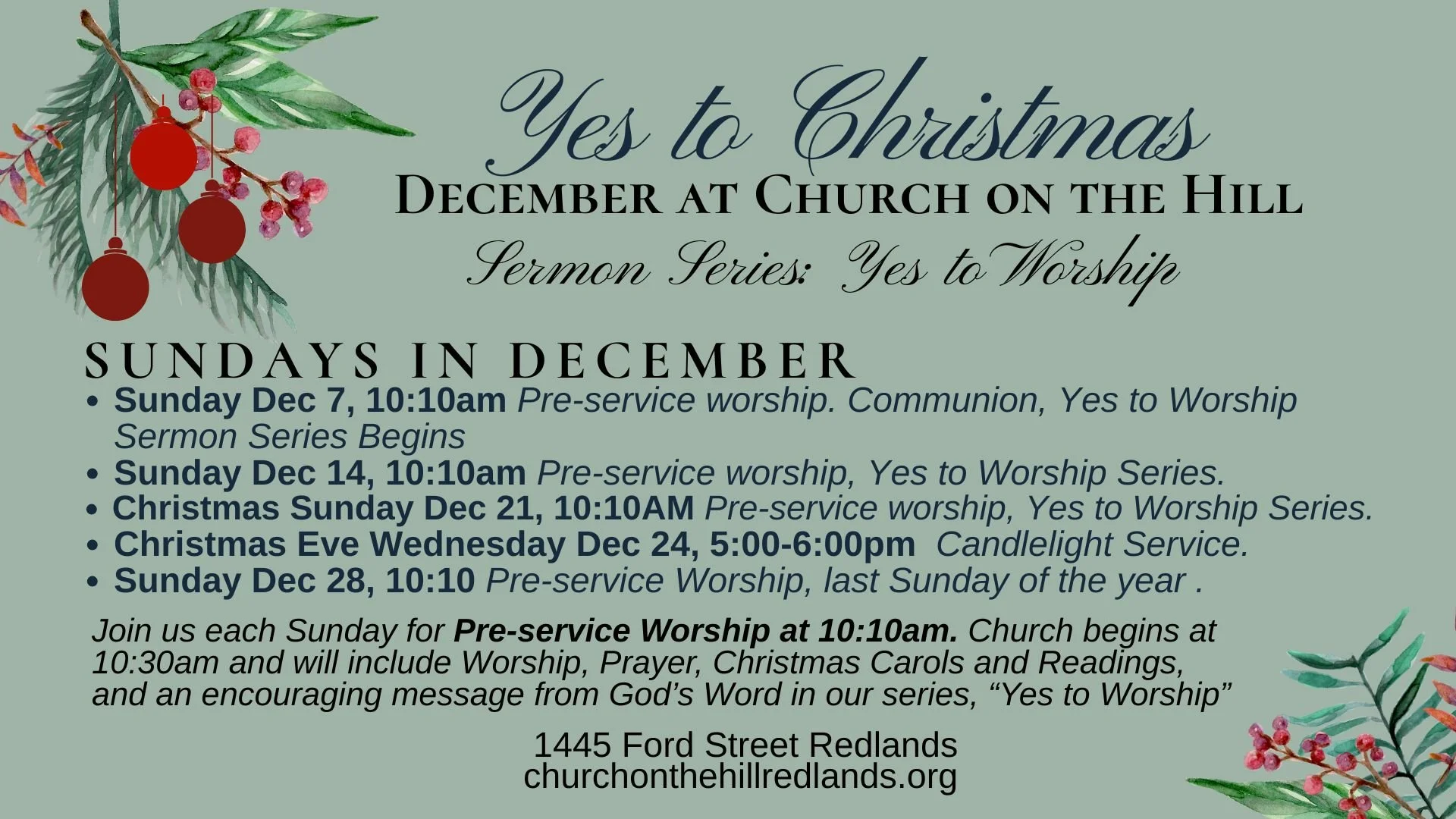 Join us each Sunday in December for Pre-service Worship meets 10:10am in the Main Auditorium