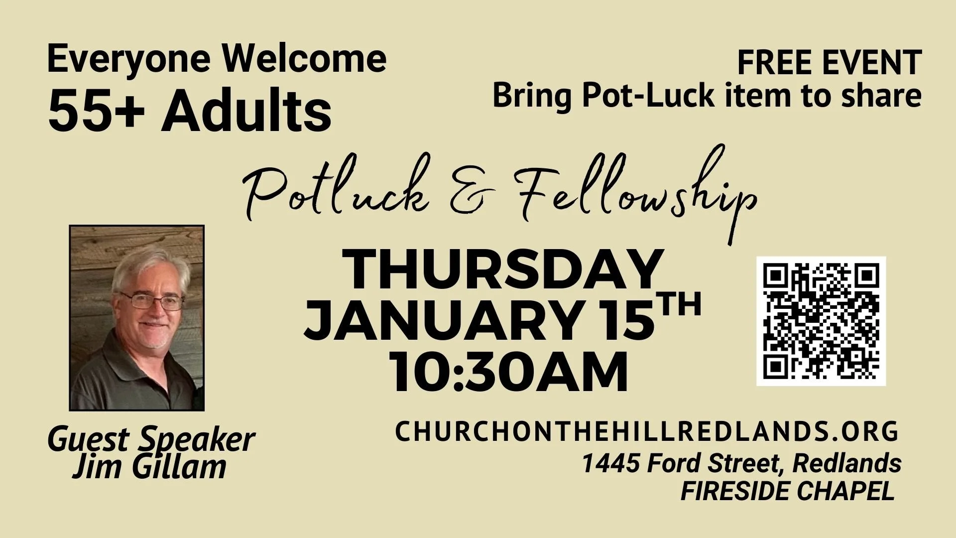 This is a FREE event. We ask that everyone please bring something to share for our potluck and always feel free to bring a friend. See you soon. We meet in the Fireside Chapel.