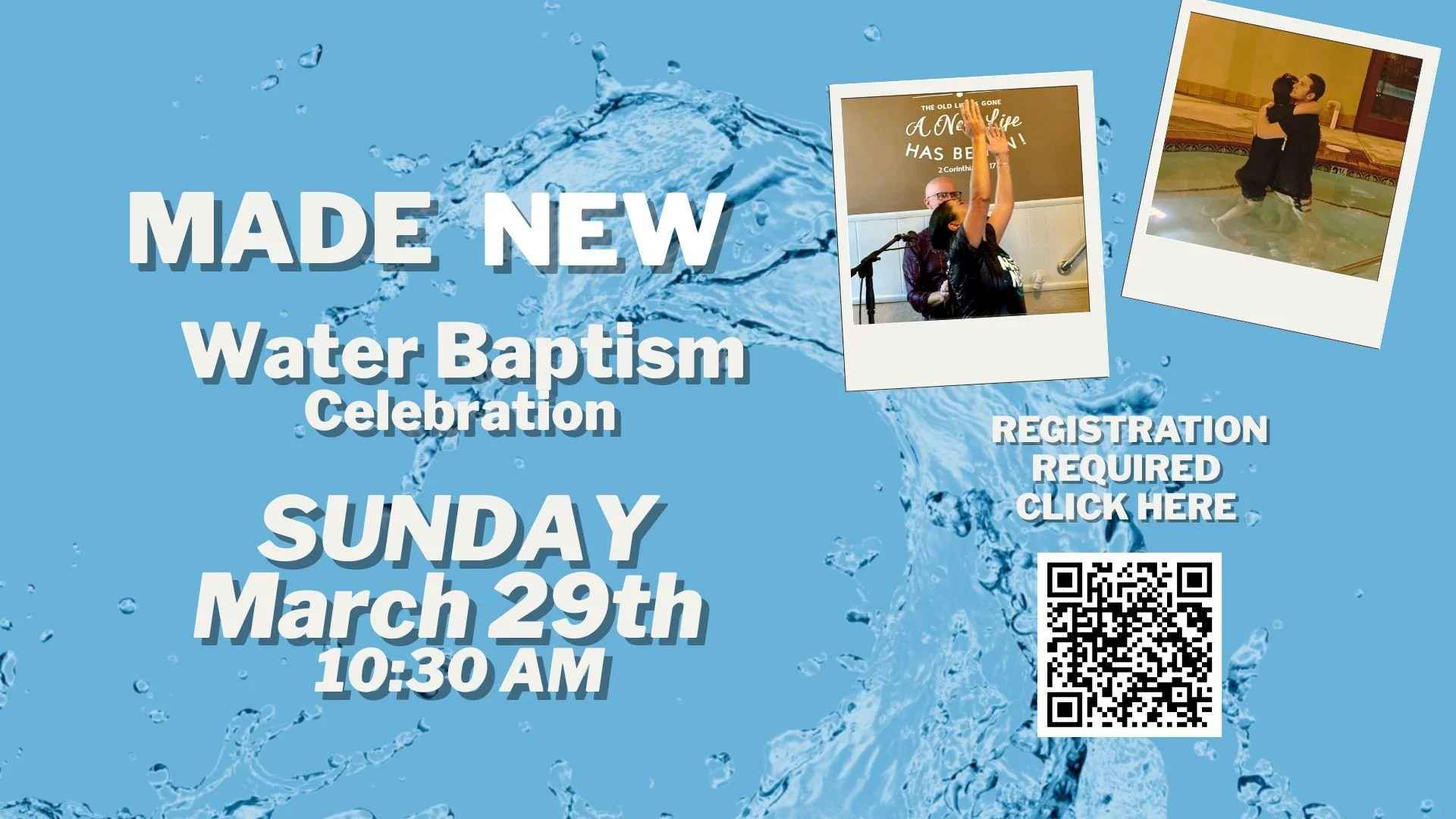 Registration required click here https://churchonthehillredlands.org/water-baptism