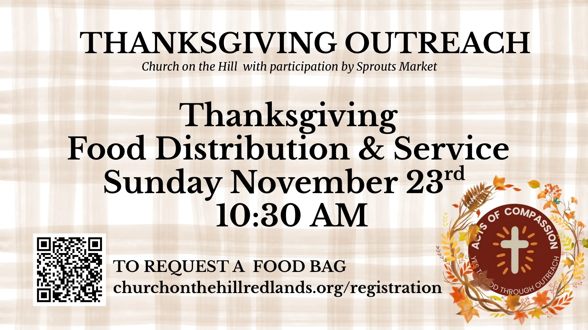 We invite you to attend an encouraging service including friendship, worship, prayer and a message from Gods Word the Bible . Bags will be distributed to those who sign up and then on a first come first served basis on Sunday Nov 23rd 10:30AM.