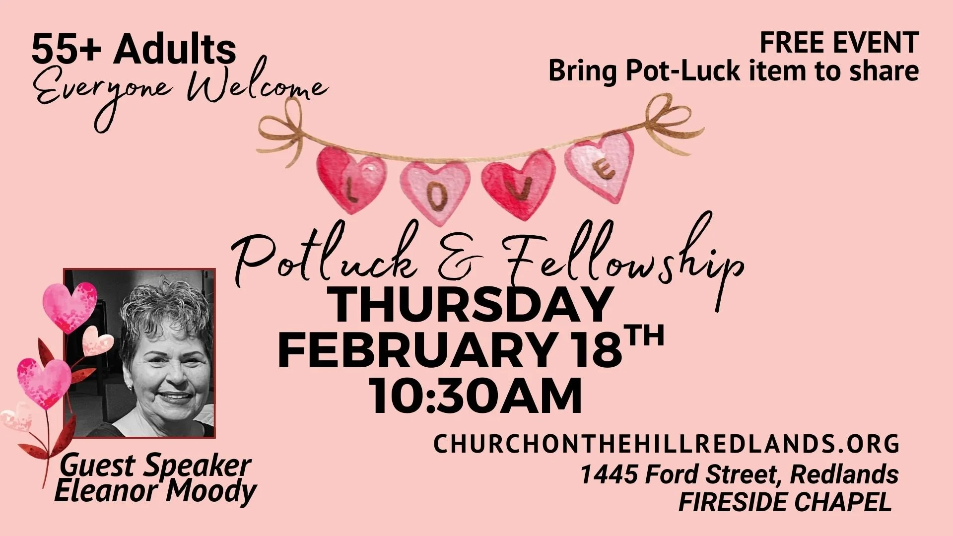 This is a FREE event. We ask that everyone please bring something to share for our potluck and always feel free to bring a friend. See you soon. We meet in the Fireside Chapel.