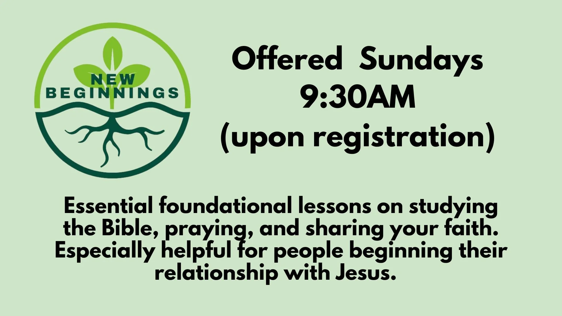 New Beginnings class which is a 3 week class for people who are just beginning their relationship with Christ. This class meets by appointment. Each Sunday we offer the New Beginnings class to anyone who would like to attend. Visit the Connect Corner to sign up. The class meets in Room 201.